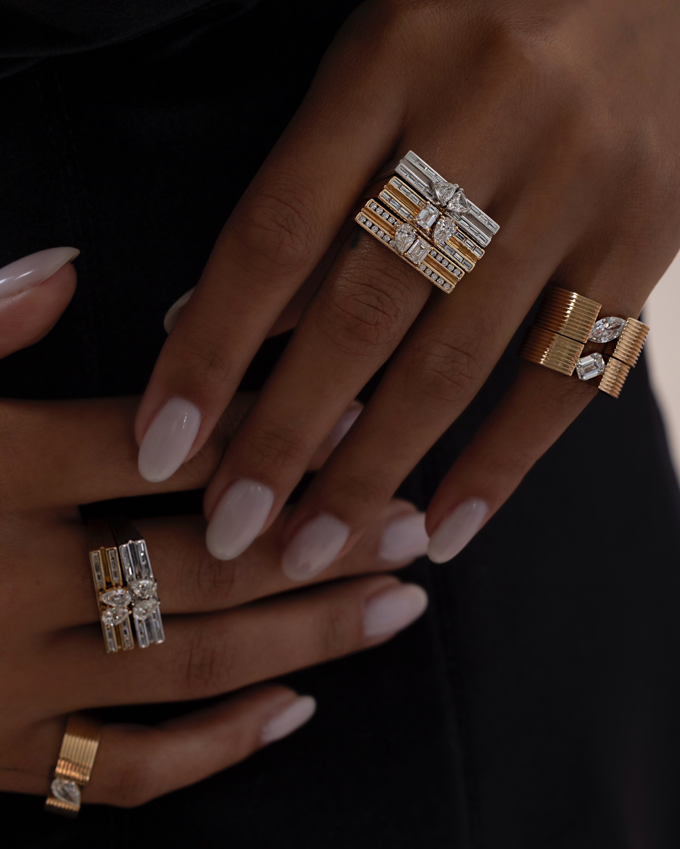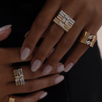 Double band magic unified by emerald and oval stones encrusted within double prongs for that extra touch of allure. A twin flame influence that showcases the electrifying energy of a double powerhouse. Versatility at its highest from, bringing that bloom of glamor from day to night.